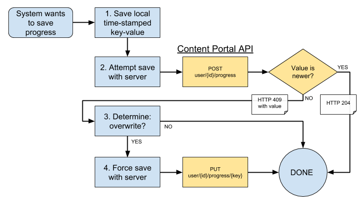 The Progress API is a generic key-value store intended to store user data across a variety of game systems. Keys are unique strings and values are arbitrary JSON objects; the server enforces no further schema upon keys or values. Thus, the burden of making sense of the data stored here is entirely upon the client systems.